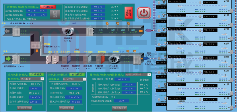 節(jié)能環(huán)保:PLC 恒溫恒濕空調(diào)控制系統(tǒng)采用高效節(jié)能的空調(diào)設(shè)備和控制策略,有效降低能源消耗,提高能源利用效率,減少對(duì)環(huán)境的影響,系統(tǒng)可實(shí)現(xiàn)多工況焓值分區(qū)節(jié)能控制,可根據(jù)室外氣 象條件以及不同熱濕負(fù)荷變化采用不同的控制模式,最大化的既保證恒溫恒濕的精度,又保證最大化節(jié)能效果。